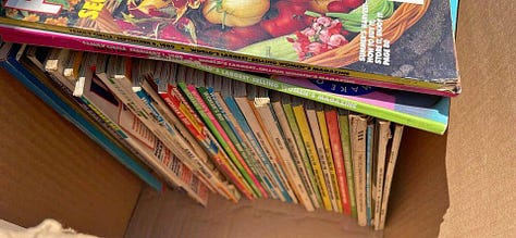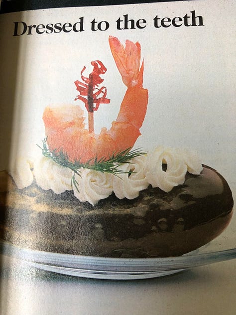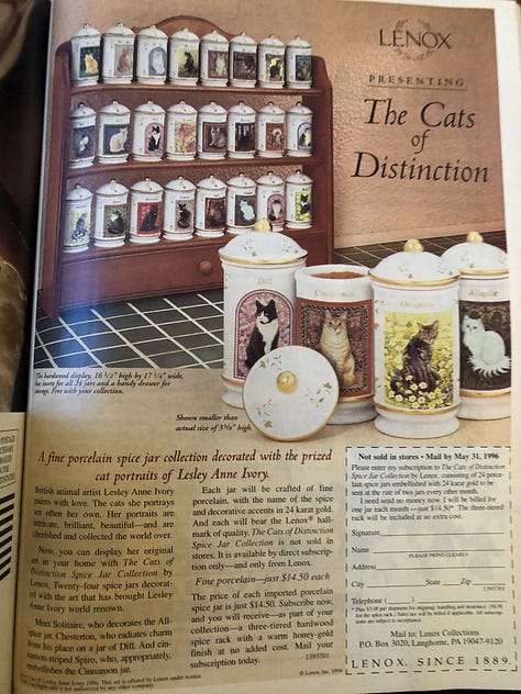 Around the same time, Facebook Marketplace showed a listing for a free box of magazines dating back from 1976 to 1993. Score! Looking through those magazines was like taking a trip with Mary McFly in Doc Brown’s DeLorean. I remember the Lenox spice jar collections (like the ones on the right image above, featuring cats), but I didn’t remember the hamster-ball-baby-toy, or the recipe that used dill pickles, shrimp, and whatever the white stuff is. Cream cheese? Cool whip? It was the 80s, so anything’s possible.