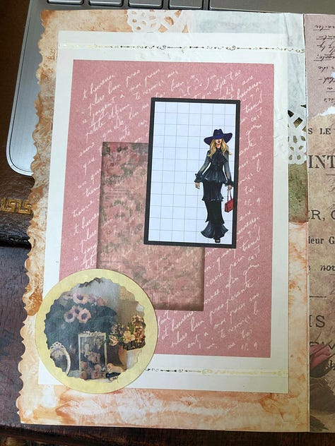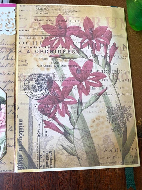 These are some of the pages I’ve created. They represent a mix of the items I curated during the first few weeks of my junk journaling obsession. This was a pamphlet that folded out several times. The photos are from the front and back of the pamphlet and, as you can see,